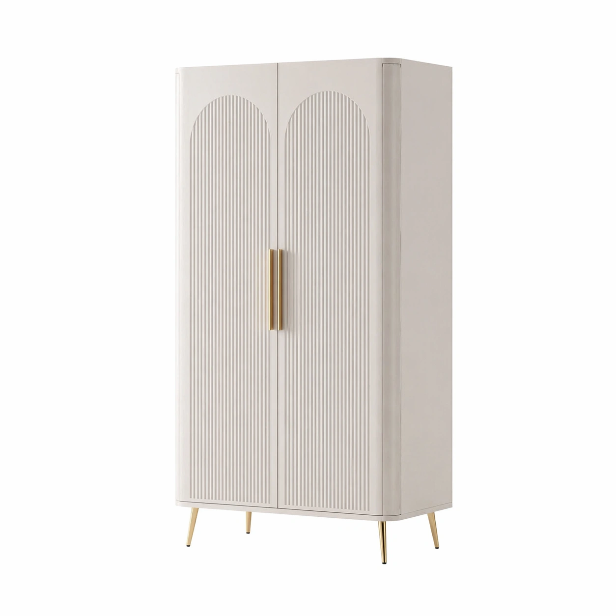 Dieser Kleiderschrank besteht aus MDF mit Metallgriffen und -beinen. Er verfügt über zwei Schwingtüren und drei Regalböden.